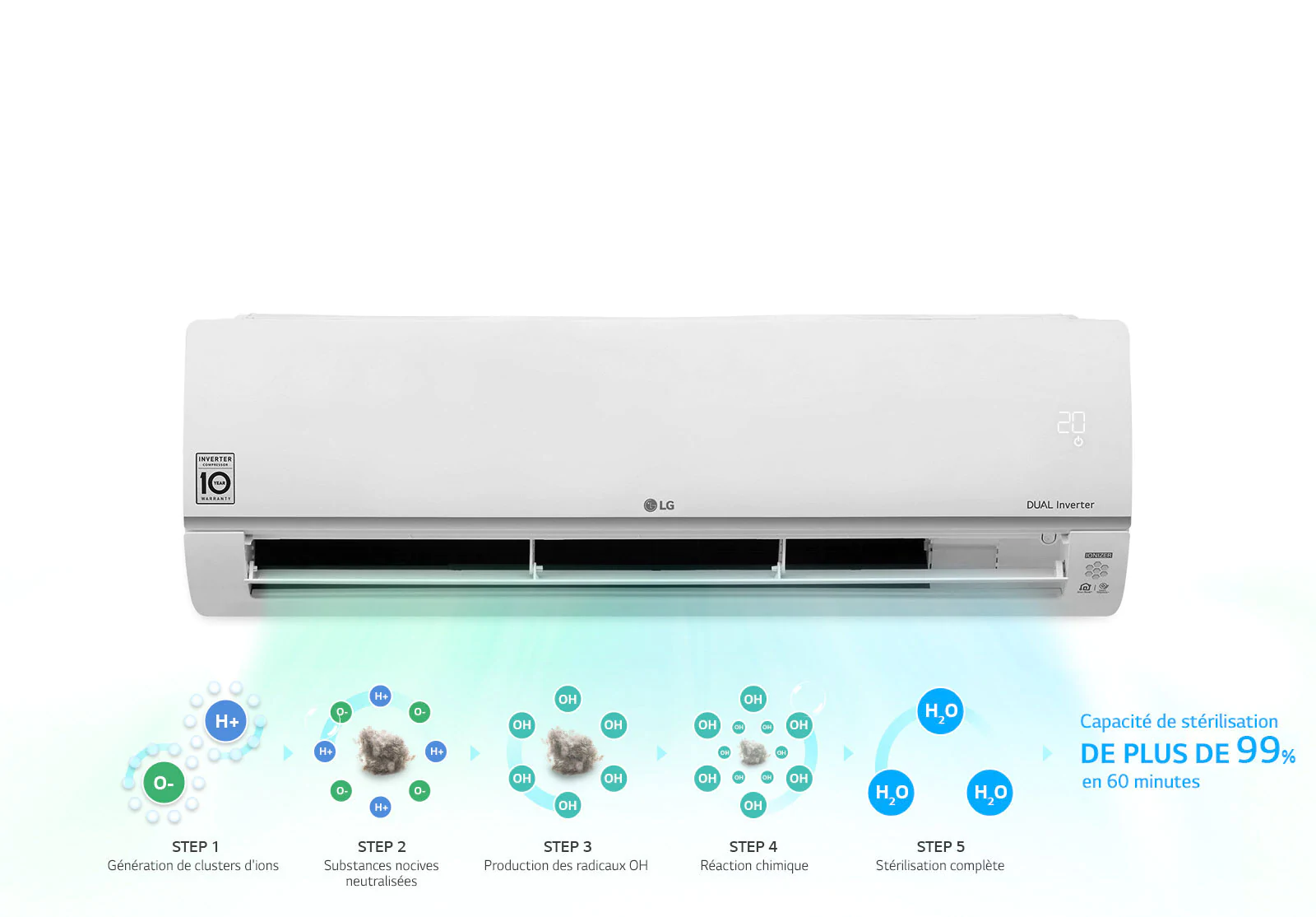 Design Stylish ARTCOOL Compresseur à onduleur garanti 10 ans Économie d énergie et refroidissement rapide l ioniseur stérilise plus de 99% des bactéries incrustées dans les 60 minutes stérilisent non seulement l air qui traverse le climatiseur, mais aussi les odeurs et les substances nuisibles autour du climatiseur. Accédez à votre climatiseur au moyen d un appareil équipé du Wifi et du applications exclusive de contrôle de LG. fonctionnent à de faibles niveaux sonores, Dimensions interne 998 x 345 x 212 mm Poids 13.2kg Dimensions externe 770 x 545 x 288 mm