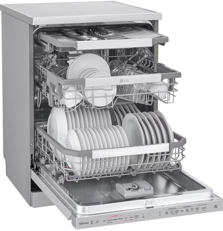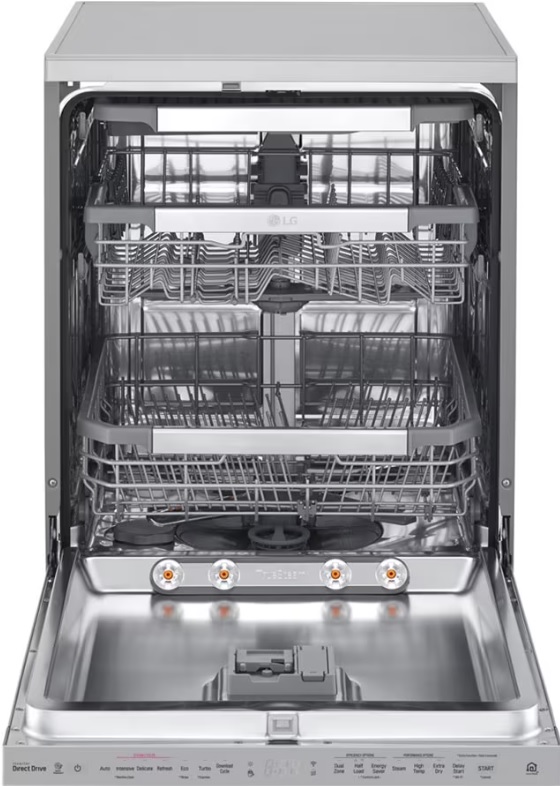 Dimension 600mm(W) * 850mm(H) * 600mm(D) Moteur Inverter Direct Driver TrueSteam" QuadWash" EasyRack' Plus Performance superieure et confort d'utilisation SmartThinQ Couleur Acier inoxydable Noble Consommation d'eau 9.6L Materiau de la cuve Acier inoxydable NeveRuste energie A+++ Couverts 14 3e panier Le tiroir a couverts intelligent Pour Plus D'info Visiter https://www.lg.com/ma/lave-vaisselle/lg-DFB325HS