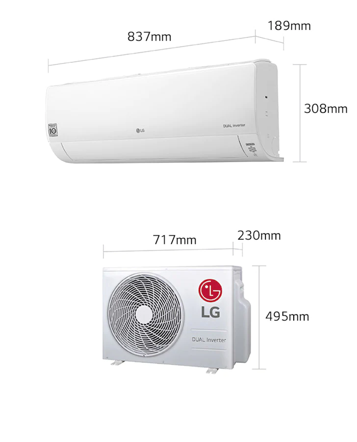 LG DUALCOOL Inverter | Garantie 10 ans | 12 000 BTU | Chaud & Froid Capacite - Frigorifique - Min / Nominale / Max W 880/3490/3870 Calorifique +7 AC - Min / Nominale / Max W 880/3520/4040 E.E.R. 3.21C.O.P 3.61 Label d'energie Frigorifique / Calorifique A(Refroidissement) , A(Chauffage) Niveau sonore - Frigorifique - S/L/M/H 21/28/36/42 dBA Niveau sonore - Calorifique - L/M/H 31/36/42 dBA Dimensions 837 x 308 x 189 mm Poids 8.4kg EXTERIEURE Niveau sonore (Frigorifique Haut) 51 dBa Dimensions 717 x 495 x 230 mm INFORMATION SUR L'AGENT FRIGORIGINE Gaz a effet de serre fluores : Oui Quantite d'agent frigorigine precharge (kg) 0.8 Type d'agent frigorigine R410a Pouvoir de rechauffement global (PRG) de l'agent frigorigine 675 PRG total (equiv. en tonnes de CO2) 0.54